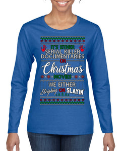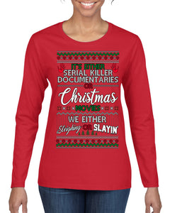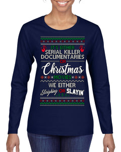 Serial Killer Docs or Christmas Movies Slaying Sleighing Ugly Christmas Sweater Womens Graphic Long Sleeve T-Shirt