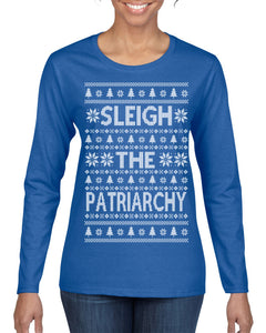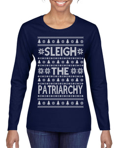 Sleigh the Patriarchy Funny Feminist Middle Class Meme Ugly Christmas Sweater Womens Graphic Long Sleeve T-Shirt