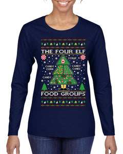 The Four Elf Food Groups Candy Canes Syrup Funny Ugly Christmas Sweater Womens Graphic Long Sleeve T-Shirt