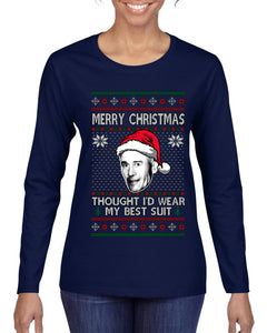 Thought I'd Wear My Best Suit Ed Gein, Ugly Christmas Sweater Womens Graphic Long Sleeve T-Shirt