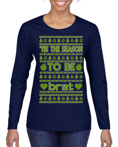 Tis the Season to Be Brat Green Text, Xmas Viral Meme Music Rave Concert Merch Ugly Christmas Sweater Womens Graphic Long Sleeve T-Shirt