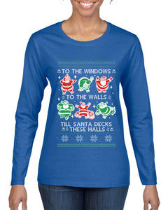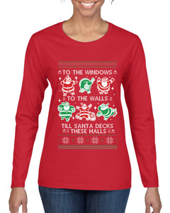 To The Windows To The Walls Till Santa Decks These Halls, Ugly Christmas Sweater Womens Graphic Long Sleeve T-Shirt