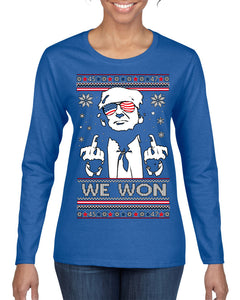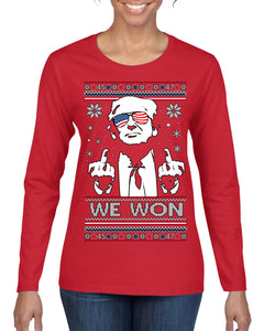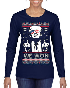 We Won Funny 45 47 President Trump Shot USA Glasses Ugly Christmas Sweater Womens Graphic Long Sleeve T-Shirt