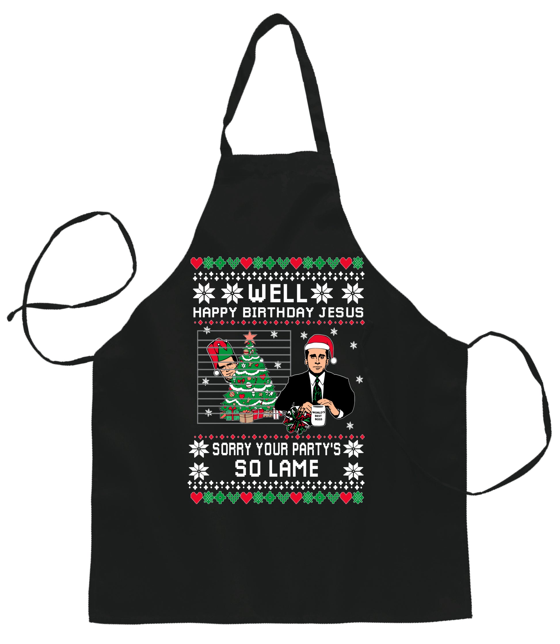 Well Happy Birthday Jesus Sorry Your Party's So Lame Ugly Christmas Sweater Ugly Christmas Butcher Graphic Apron for Kitchen BBQ Grilling Cooking