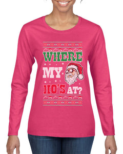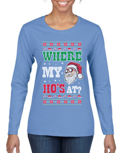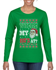 Where my Hos At Santa Funny Ugly Christmas Sweater Womens Graphic Long Sleeve T-Shirt