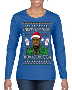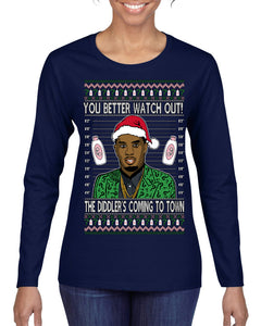You Better Watch Out, the Diddler's Coming to Town, Funny Santa P Diddy Diddler Funny Party Viral Music Baby Oil Meme Ugly Christmas Sweater Womens Graphic Long Sleeve T-Shirt