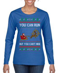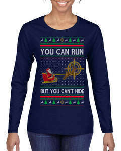 You Can Run But You Can't Hide Santa Sleigh Reindeer Ugly Christmas Sweater Womens Graphic Long Sleeve T-Shirt
