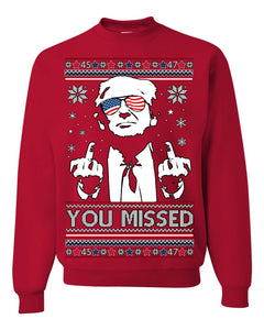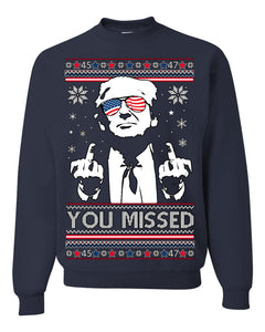 You Missed Funny 45 47 President Trump Shot USA Glasses Ugly Christmas Sweater Crewneck Sweatshirt