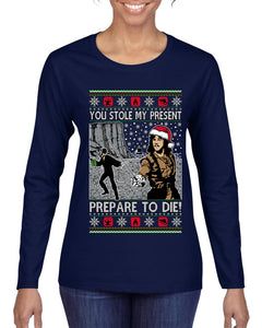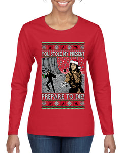 You Stole My Present Prepare To Die Cult Classic, Ugly Christmas Sweater Womens Graphic Long Sleeve T-Shirt